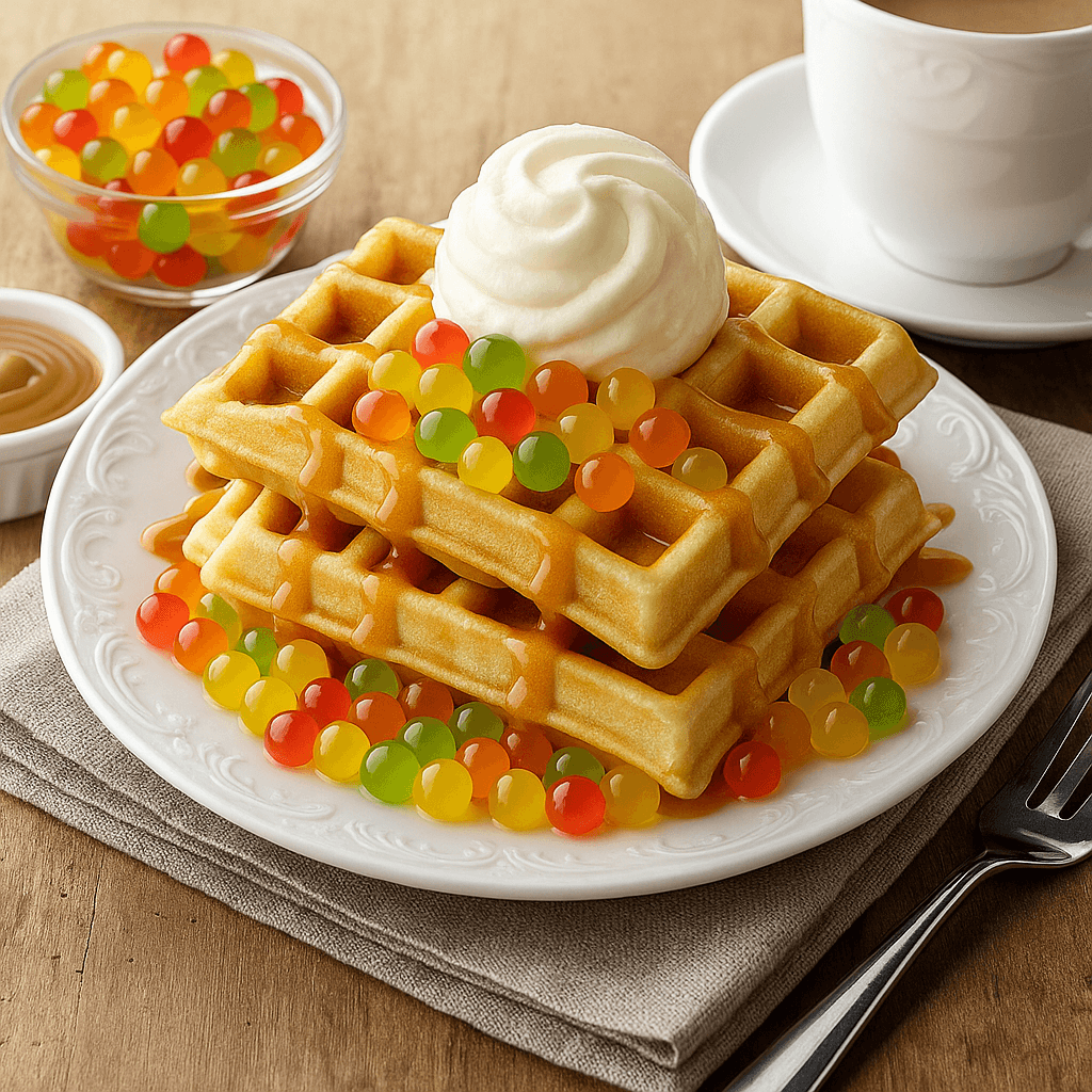- วาฟเฟิลกรอบนอกนุ่มใน + ครีมชีส + มุกป๊อป