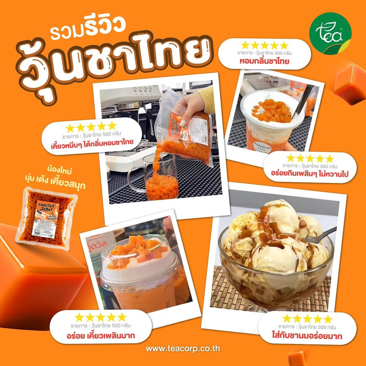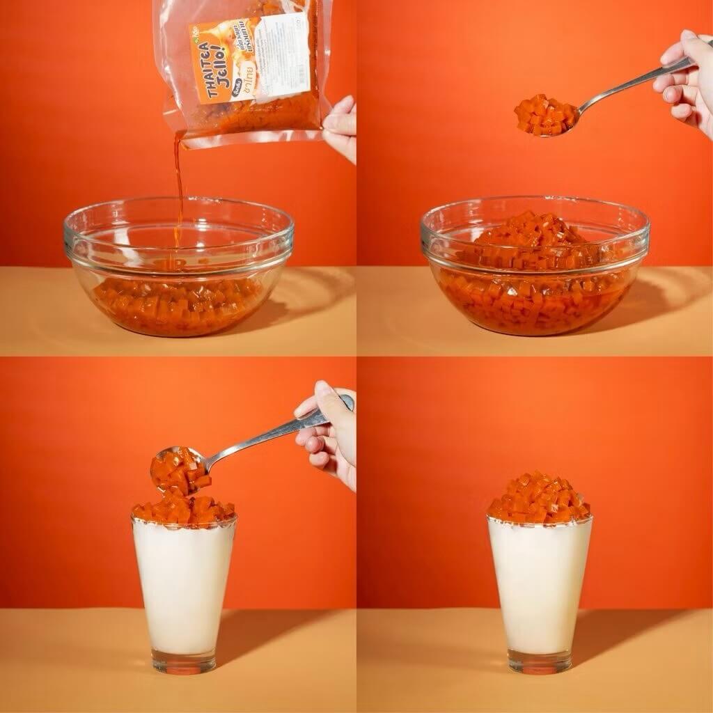 วุ้นชาไทยสำเร็จรูป พร้อมทาน เนื้อนุ่ม เคี้ยวง่าย อร่อยพร้อมทาน เข้ากันกับทุกเมนู เพิ่มมูลค่าและเสน่ห์ให้กับเครื่องดื่มในแบบสไตล์ไทยๆ